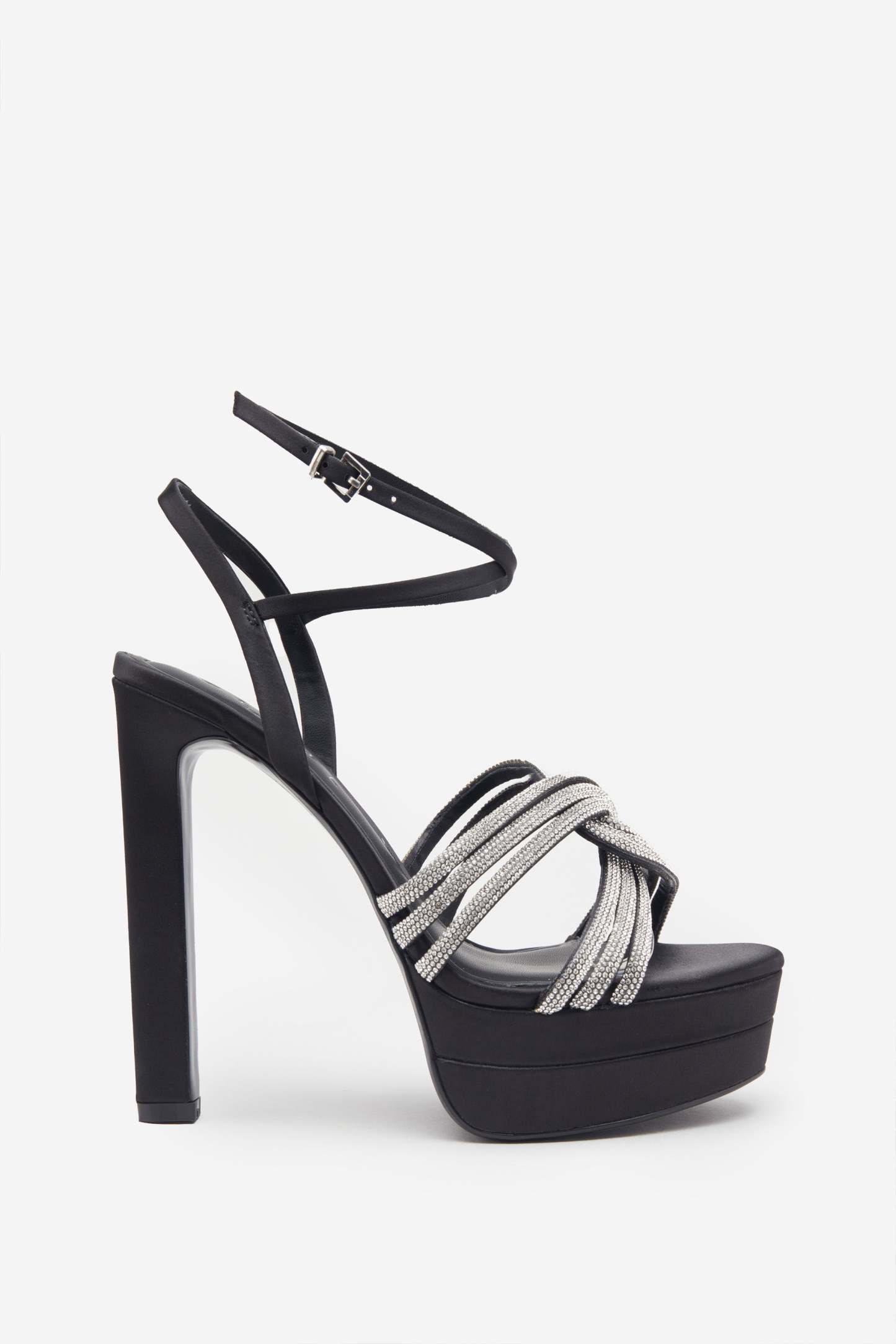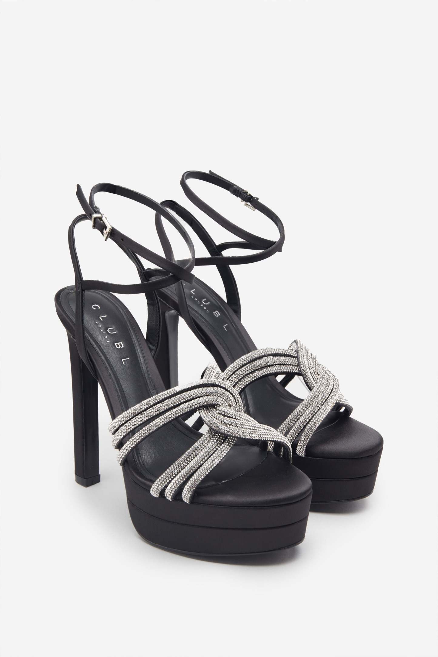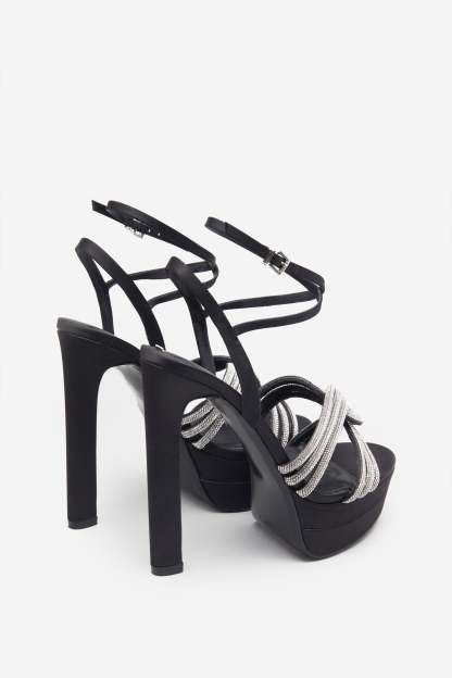 Black Satin Diamante Strappy Platform Heels