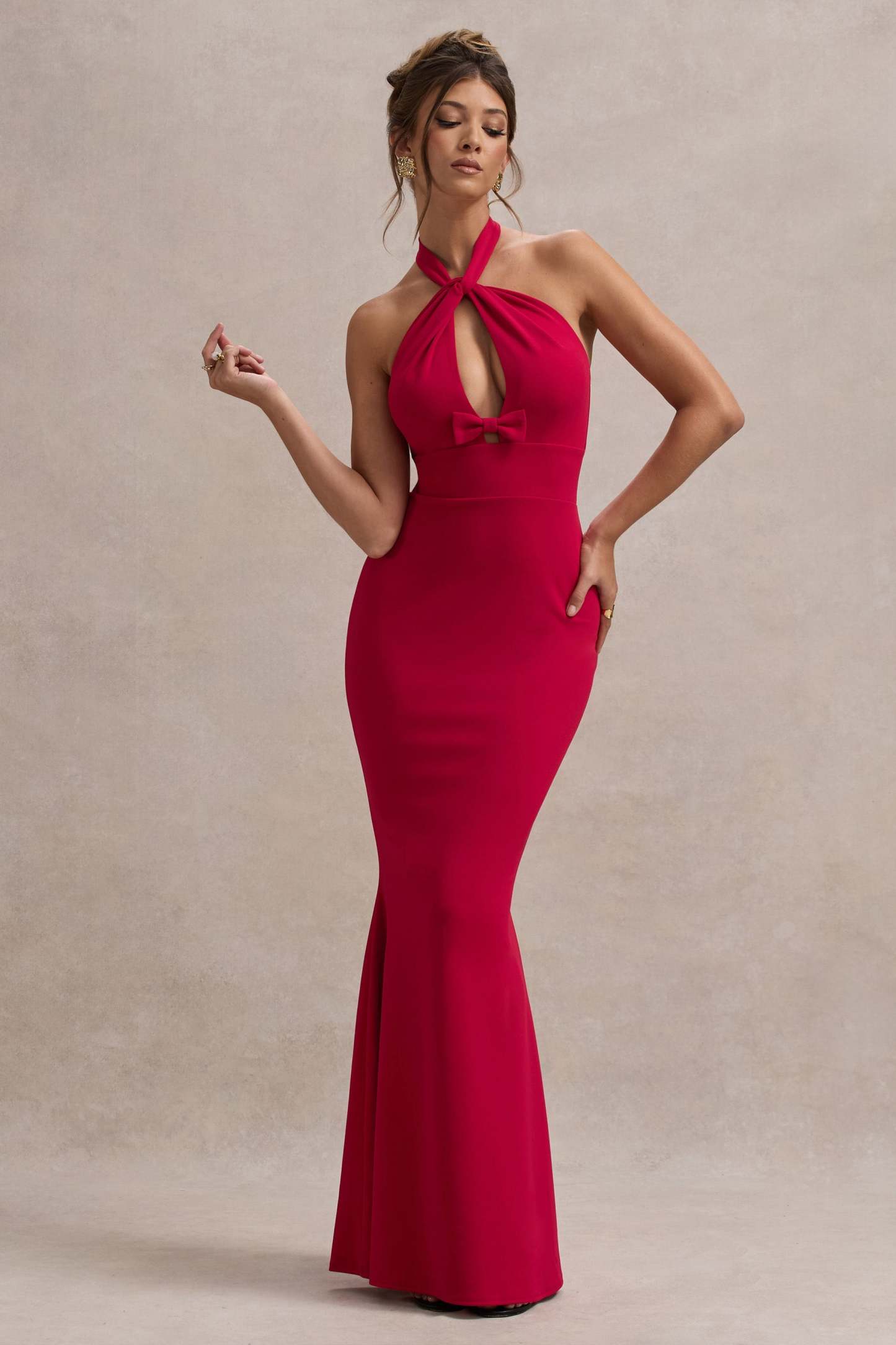 Opt for opulence at your next event in Raelynn, our timeless maxi dress. Designed in a red shade of our premium scuba crepe, this floor-sweeper features a halter neckline, keyhole cut-out and sweet white bow that sits front and centre.